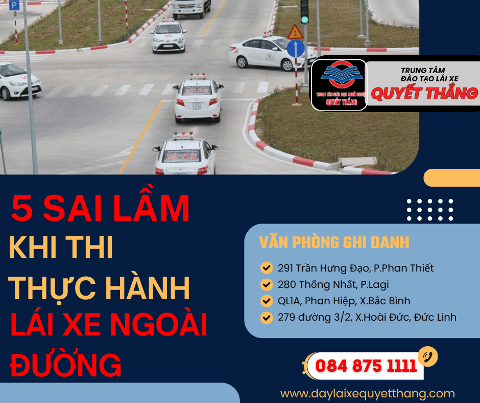 Thi thực hành lái xe ngoài đường không quá khó nếu bạn hiểu rõ quy định và tránh được những lỗi nhỏ nhưng dễ mắc phải. Năm sai lầm phổ biến nhất gồm: không quan sát gương, quên bật xi-nhan, đi sai làn, vượt hoặc thiếu tốc độ, và không nhường đường đúng quy định. Nếu chú ý luyện tập và giữ tâm lý vững vàng, bạn hoàn toàn có thể vượt qua kỳ thi sát hạch với kết quả tốt.